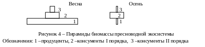 Что такое биомасса экосистемы? Каким параметром она определяется? Какие организмы формируют первичную продукцию экосистемы, а какие вторичную? На рисунке 4 представлены пирамиды биомассы пресноводной экосистемы (озеро, пруд), характерные для весны и ранней осени. Как Вы думаете, какими параметрами определяются такие различия в пирамидах?