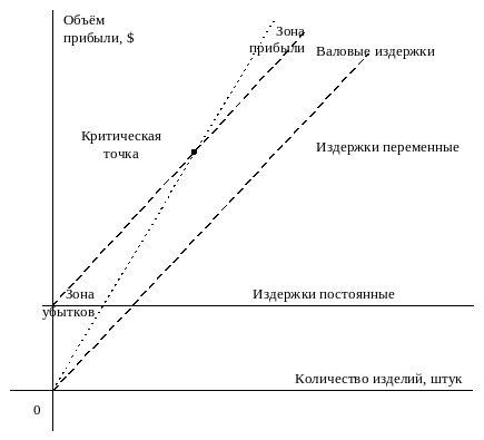 С помощью этого графика можно найти так называемую точку безубыточности, то есть тот объем производства, при котором кривая, показывающая изменение выручки от реализации (при заданном уровне цен), пересечется с кривой, показывающей изменение себестоимости продукции. Допускается несколько вариантов такого графика, соответствующих разным уровням цен на продукцию.