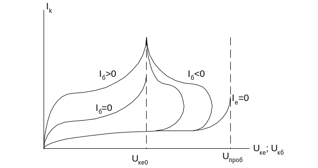 При постійному струмі бази, якщо наближати напругу UK до напруги перевороту фази, коефіцієнт передачі буде умовно досягати безконечності, а відповідно може відбутися пробій транзистора, ввімкненого по схемі з спільним емітером. Якщо струм бази зафіксувати – обірвати базу, або в її коло ввімкнути великий опір – в транзисторі буде діяти зворотній зв’язок, і носії заряду, які створилися за рахунок лавинного розмноження, будуть розділятися полем колекторного переходу; при цьому неосновні носії будуть йти в колекторний перехід, а основні – в базу. В зв’язку з цим в базі створиться збитковий заряд і зміниться її потенціал, що приведе до відкриття емітерного переходу, і якщо база обірвана, то основні носії, які накопичилися в базі, можуть рекомбінуватися в ній, або відбудеться вторинна рекомбінація. Крім того вони можуть повернутися в емітер. У нормально виготовлених транзисторів таке явище, як перехід основних носіїв із бази в емітер, практично неможливе, тому повинна відбутися рекомбінація носіїв в базі. Таким чином незначне збільшення основних носіїв в базі за рахунок лавинного розмноження може привести до значного збільшення інжекції носіїв із емітера. Цей процес викличе нестабільну роботу транзистора. Якщо струм колектора обмежений, то лавинний пробій не переростає в тепловий і при зменшенні напруги робота транзистора відновлюється. Із цього можна зробити наступний висновок.