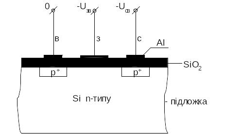 легованої підкладки і областями сильно легованих областей стоку і витоку. При підключенні напруги, полярність якої при підключенні співпадає з напругою витік-стік, під затвором на поверхні підкладки буде створюватися збіднена зона напівпровідника, тому що основні носії за рахунок дії напруженості електричного поля будуть відходити в глибину напівпровідника. При збільшенні напруги на затворі UЗ під затвором виникне інверсна зона, провідність якої буде такою, як і провідність областей стоку і витоку. Напруга, при якій починає створюватися інверсна зона (канал), називається пороговою напругою. При наявності напруги витік-стік через канал будуть рухатися носії заряду, створюючи струм в каналі і в зовнішньому колі. Збільшення напруги приводить до зростання ширини каналу і росту струму. Таким чином такий транзистор працює в режимі збагачення. Величина напруги між каналом і затвором обмежена стійкістю діелектрика і може досягати десятків вольт.