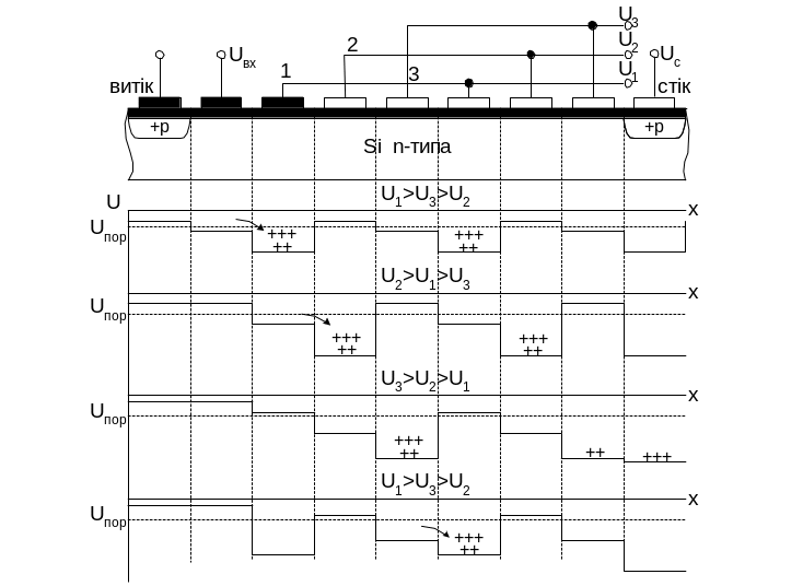 Третя секція – вихідна. Це p-n-перехід стоку, який зміщений в зворотному напрямі, і напруга на якому буде змінюватися при проходженні пакету носіїв заряду.
