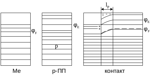 В металі заборонена і валентна зони перекривають одна одну. Відповідно енергія електронів в металі значно більша енергії носіїв заряду напівпровідника. Якщо взяти метал і р- напівпровідник то рівень Фермі металу буде лежати значно вище рівня Фермі напівпровідника.