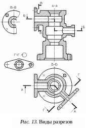 сложные – при нескольких секущих плоскостях (например, разрез Б–Б, рис. 13).