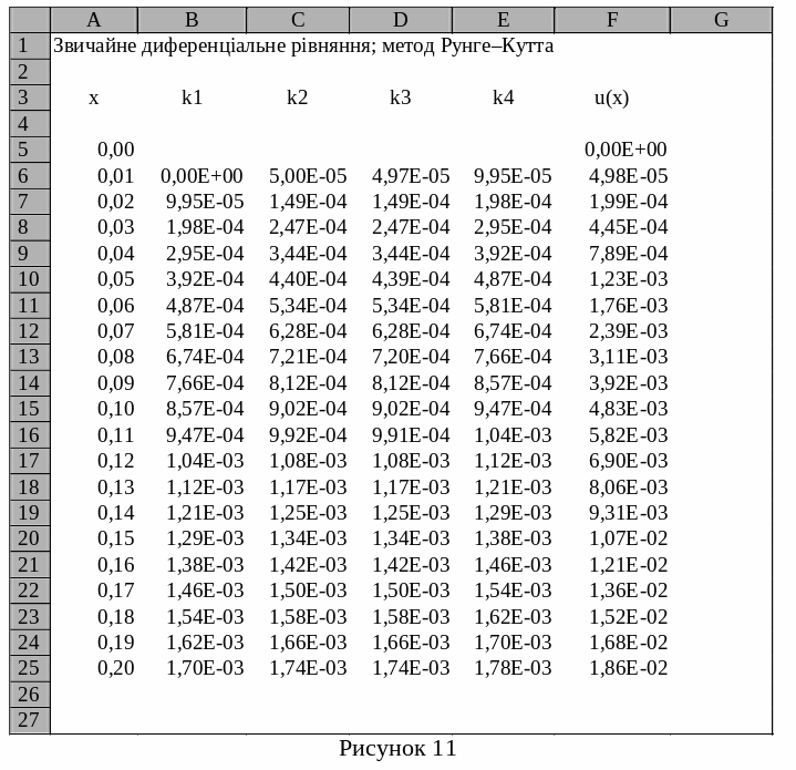 Розв’яжемо наш приклад на листі електронної таблиці з використанням методу Рунге–Кутта. Всі умови задачі залишаються такими ж, змінюється тільки структура таблиці.