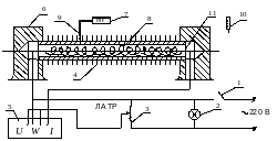 Потребляемая мощность ТЭН регулируется лабораторным автотрансформатором (ЛАТР) (3) и измеряется ваттметром Д5067 класса 0,5 (5).
