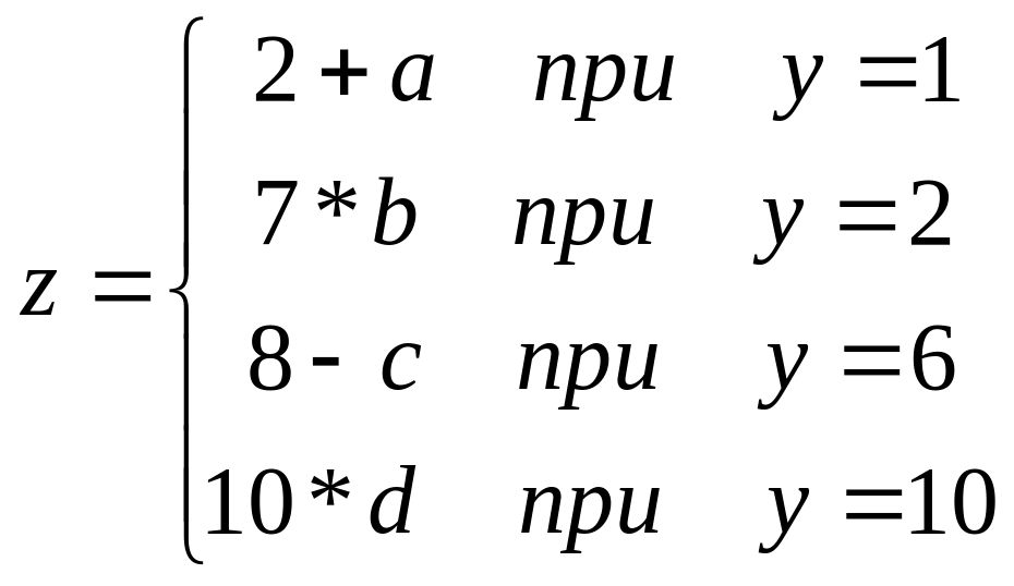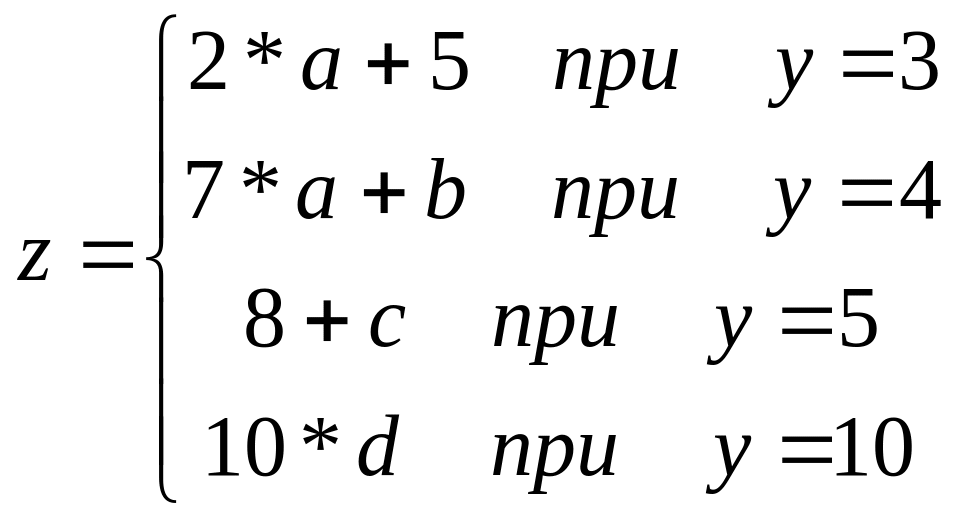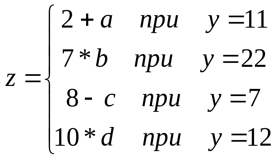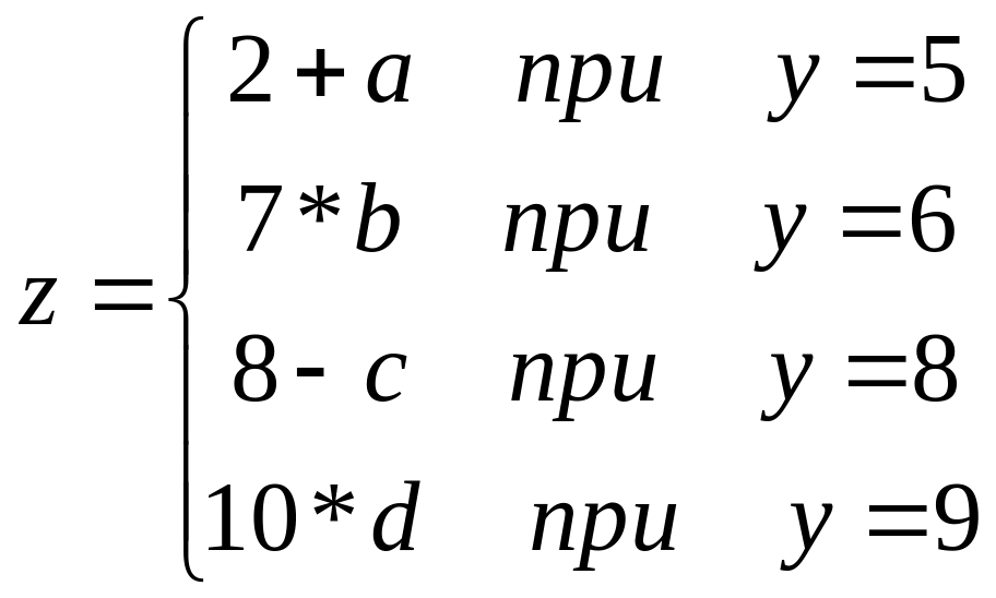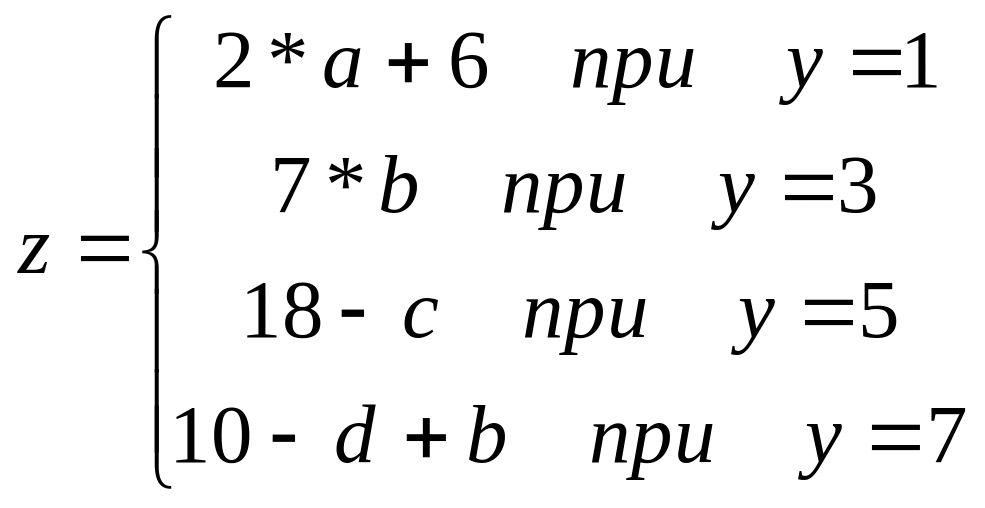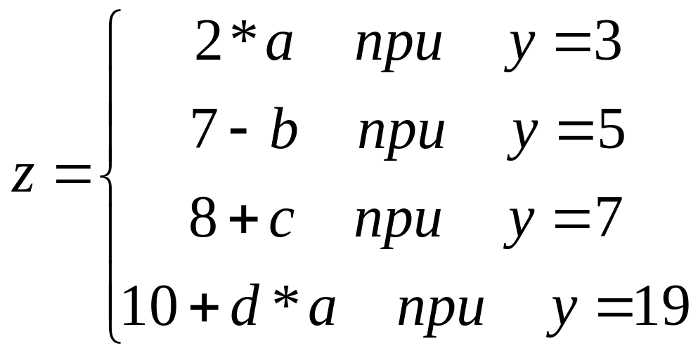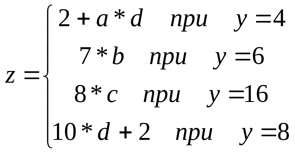 В залежності від значення, яке приймає y, обчислити значення z, результат вивести на екран. Якщо значення y не прийме ні одного з перерахованих значень, то на екран вивести повідомлення “default”. Значення a, b, c та d ввести з клавіатури. Результат вивести на екран.