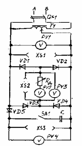 Дослідження перетворювача виконують на експериментальній установці, яка складається з двонапівперіодного мостового випрямляча на діодах VD1...VD4 і однонапівперіодного на діоді VD5. Додатковий резистор Rд служить для градуювання магнітоелектричного вимірювального механізму. Магніто- електричним вольтметром PV4 вимірюють середню випрямлену напругу для однонапівперіодної схеми при вимкненому вимикачі SAl і амплітуду синусоїдної напруги при підключеному конденсаторі C за допомогою вимикача SA1. Вольтметр PV1 електромагнітної системи вимірює діючу синусоїдну напругу. Гнізда XS1...XS3 служать для підключення осцилографа. Живлення установки здійснюється від мережі синусоїдної напруги А,В через автоматичний вимикач QF1 і регулюючий автотрансформатор TV1.