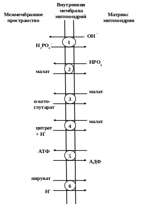 1 – переносчик фосфата, 2 – переносчик дикарбоксилатов, 3 – переносчик α-кетоглутарата, 4 – переносчик трикарбоксилатов, 5 – переносчик адениновых нуклеотидов, 6 – переносчик пирувата.