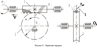 Рассечем червяк осевой плоскостью. В плоскости сечения получим зубчатую рейку. Будем вращать червяк с угловой скоростью 1. Сечение при этом будет смещаться со скоростью V.