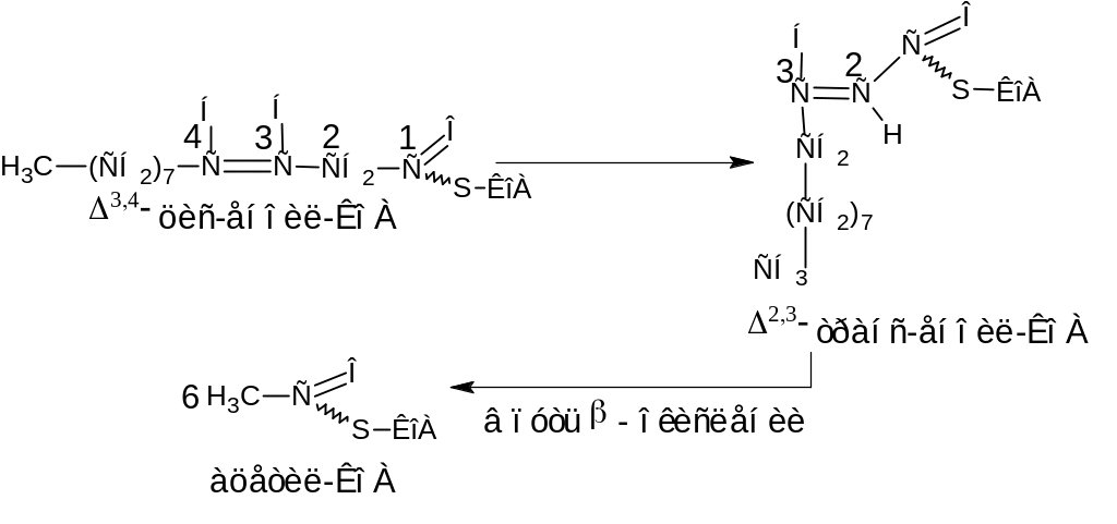 Дело в том, что образовавшаяся 12-углеродная ненасыщенная жирная кислота должна снова включиться в путь -окисления, но двойные связи природных ненасыщенных жирных кислот имеют цис-конфигурацию, а при -окислении насыщенных жирных кислот двойные связи имеют транс-конфигурацию. Кроме того, в результате последовательного удаления трех двууглеродных фрагментов (ацетил-КоА) до первой двойной связи дает 3,4– ацил-КоА (расположение двойной связи между 3 и 4 атомами углерода), а не 2,3– ацил-КоА, который является промежуточным продуктом при -окислении насыщенных жирных кислот. Поэтому в тканях существует фермент, который осуществляет перемещение двойной связи из положения 3-4 в положение 2-3, а также изменяет конфигурацию двойной связи из цис- в транс-положение.