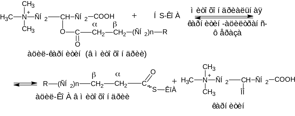 Транспорт жирных кислот внутрь митохондрий. Коэнзимная форма жирной кислоты, в равной мере как и свободные жирные кислоты, не обладает способностью проникать внутрь митохондрий, где, собственно, и протекает их окисление, переносчиком активированных жирных кислот через внутреннюю митохондриальную мембрану служит карнитин (-триметиламино--оксибути-рат):