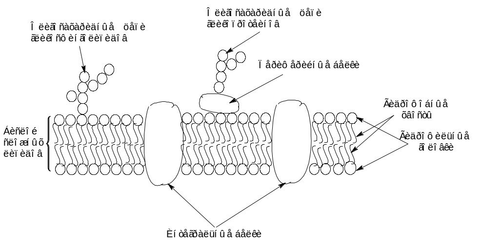 Липиды в бислое расположены так, что их гидрофобные хвосты (углеводородные остатки жирных кислот) направлены внутрь мембраны навстречу друг другу и частично перекрываются, обе поверхности бислоя составлены гидрофильными головками липидов – фосфолипидов. Белки, встроенные в липидный бислой мембраны, могут быть периферийными или интегральными. Периферийные белки связаны с полярной поверхностью бислоя относительно слабыми водородными связями и легко извлекаются из мембраны. Интегральные белки погружены в липидный слой, иногда пронизывают ее насквозь. Удерживаются они значительно прочнее за счет большего числа гидрофобных взаимодействий, водородных и других связей.