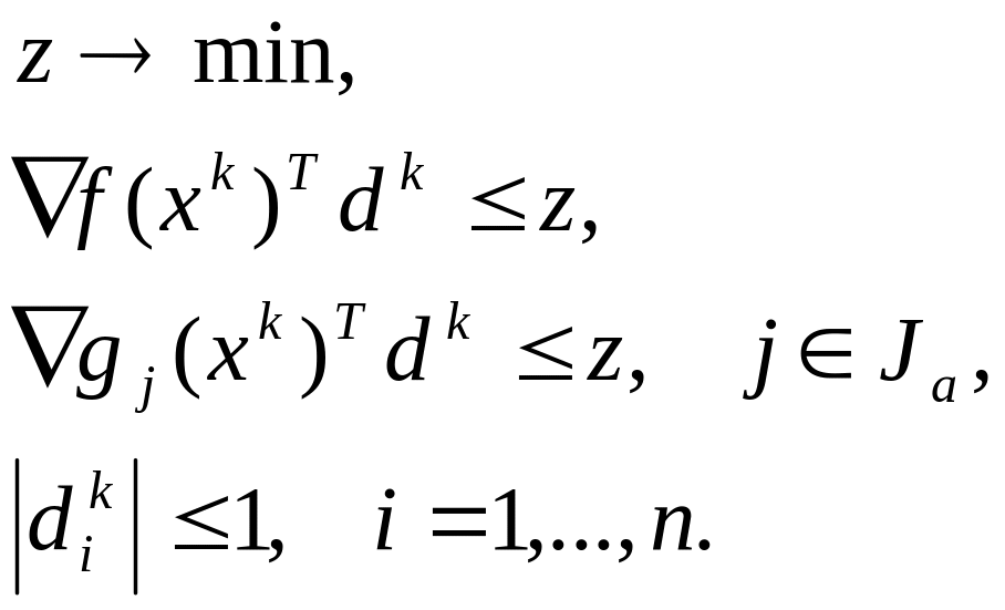 Шаг 8. решить задачу линейного программирования, сформированную на шаге 7. В результате находится искомое возможное направление спуска и - минимальное значение z.