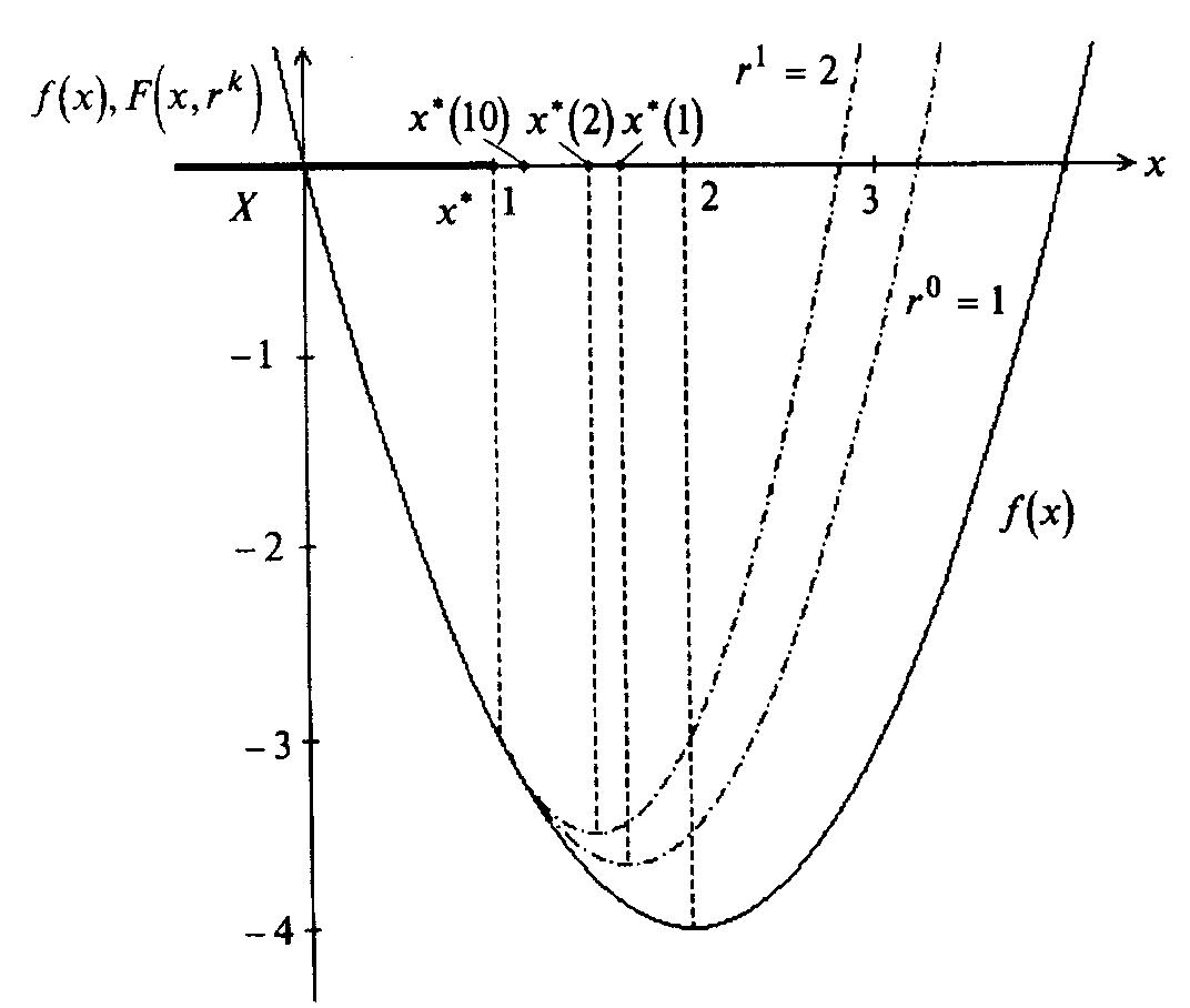 Идея метода заключается в сведении задачи на условный минимум к решению последовательности задач поиска безусловного минимума вспомогательной функции: