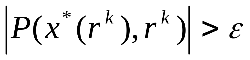 г) Т.к. большинство методов поиска безусловного экстремума использует дискретные шаги, то вблизи границы шаг может привести в точку вне допустимой области. Если в алгоритме отсутствует проверка на принадлежность точки множеству , это может привести у ложному успеху, т.е. уменьшению вспомогательной функции в точке, где она теоретически неопределена. Поэтому на шаге 3 алгоритма требуется явная проверка того, что точка не покинула допустимую область. Процедура поиска обычно завершается при некотором малом , отличном от нуля. Однако приближенное решение принадлежит множеству допустимых решений. Это одно из преимуществ метода барьерных функций.