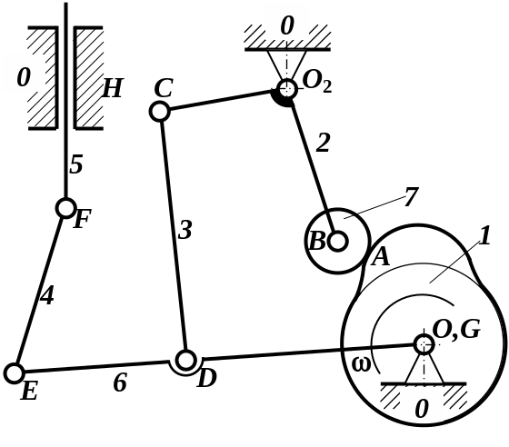 Для заданного механизма (табл. 1.2) определить по структурной формуле Чебышева (1.3) число степеней свободы. При наличии звеньев, которые создают пассивные связи или лишние степени свободы, указать их и, после изъятия с состава механизма, подсчитать действительное число степеней свободы.