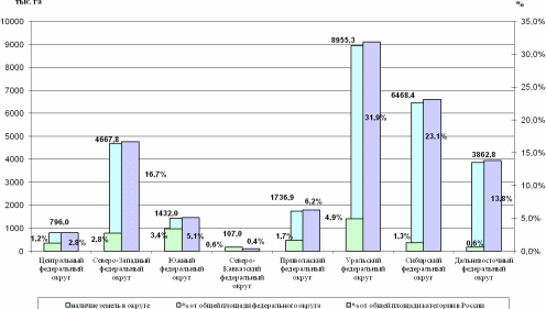 Распределение земель водного фонда по федеральным округам представлено на рисунке 1-11.
