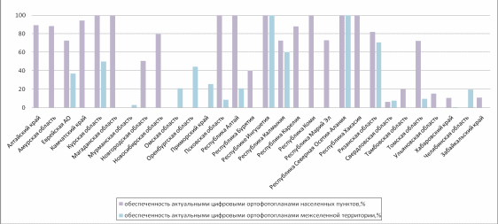 Обеспеченность каждого из вышеуказанных субъектов Российской Федерации актуальными цифровыми ортофотопланами для целей ведения государственного кадастра недвижимости к концу 2010 года отражена на рисунке 3-4.