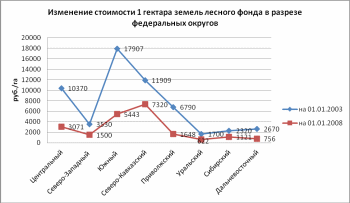 Значительное повышение стоимости 1 гектара земель лесного фонда произошло также в Центральном (в среднем в 3,4 раза), Дальневосточном (в 3,5 раза) и Южном (в среднем в 3,3 раза) федеральных округах.