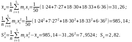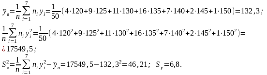 Пример 9.6. В таблице даны результаты измерений массы (х кг) и роста (у см) 50 учеников.