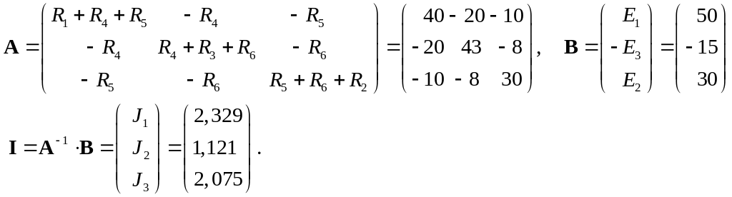 При составлении уравнений учтено, что в смежных ветвях протекают два контурных тока, направленных навстречу друг другу. Подставляем числовые значения сопротивлений и ЭДС в СЛАУ и получаем решения: