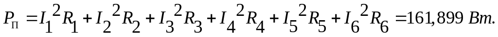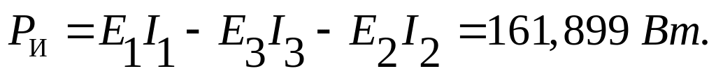 При составлении СЛАУ можно сделать ошибку, например, пропустить в нужном месте знак минус, и, как следствие, получить неправильное значение токов. Для проверки числовых значений токов обычно составляют баланс мощностей источников энергии– ЭДС и потребителей–сопротивлений. Это закон сохранения энергии – сколько энергии было выделено источниками – столько же должно быть потреблено приёмниками. Определим мощность источников и мощность приёмников для нашей схемы.