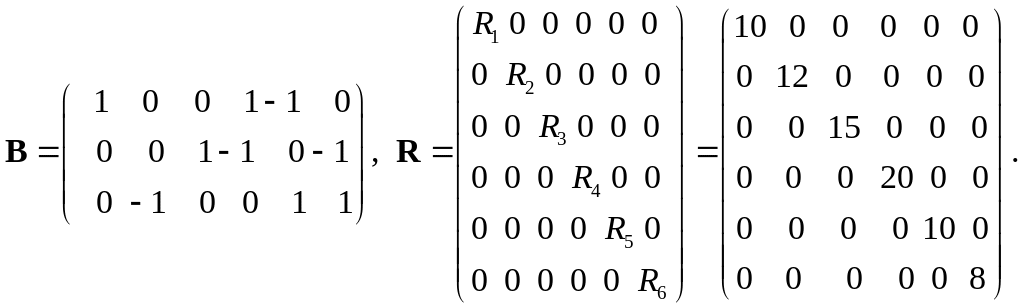 Теперь решим эту задачу примера-1 матрично–топологическим методом. Для этого нам нужны матрица контуров и диагональная матрица сопротивлений: