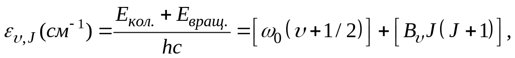 Поскольку нас интересует область, соответствующая переходу с нулевого колебательного уровня ( = 0) на первый ( = 1), для расчёта колебательно-вращательной энергии молекулы целесообразно использовать приближение гармонического осциллятора (1) и колеблющегося ротатора (2):