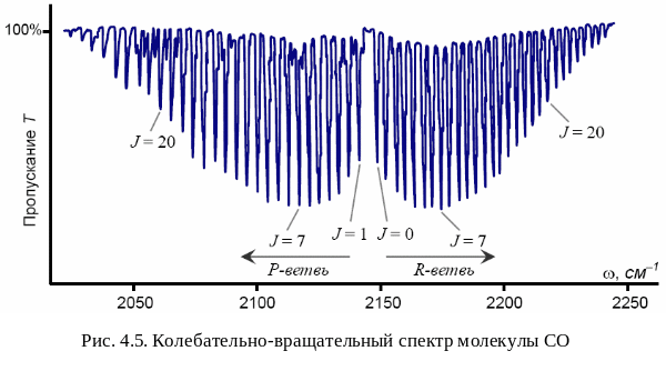 Между R- и P-ветвями находится промежуток (Q-ветвь), который соответствует чисто колебательному переходу J = 0, запрещённому правилами отбора для двухатомных молекул имеющих чётное число электронов. Рис. 4.6 поясняет, какие колебательно-вращательные переходы приводят к появлению пиков в R-ветви и P-ветви.