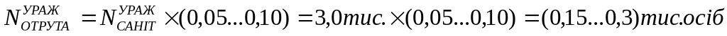 Звернімо увагу! Прогнозованою (типовою) в ураженому населеному пункті є така структура санітарних втрат населення у НС: травми —50...60%, опіки — 25...30%, отруєння — 5...10%.