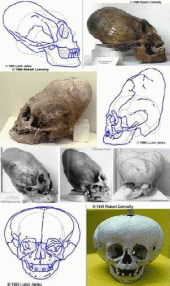 Есть предположение, что «раса господ» отличалась и внешне. Странные черепа из Ики, Перу, Мериды и Мексики служат тому подтверждением. Черепа очень сильно различаются между собой, словно принадлежат разным разновидностям, и лишь отдалённо напоминают череп человека. Первое, что бросается в глаза – это аномальная форма и размеры. Столь же необычны и два выступающих на черепе "лепестка", объём черепной коробки является наибольшим из всех экземпляров и может быть оценен более чем в 3000 см3. Однако, фрагменты челюстной кости позволяют с уверенность сказать, что она идентична современному человеку. Черепные коробки неандертальцев36 и кроманьонцев37 имели объём от 1600 до 1750 см3. Потом столь странное увеличение объёма черепов по сравнению с современным человеком (около 1450 см3).