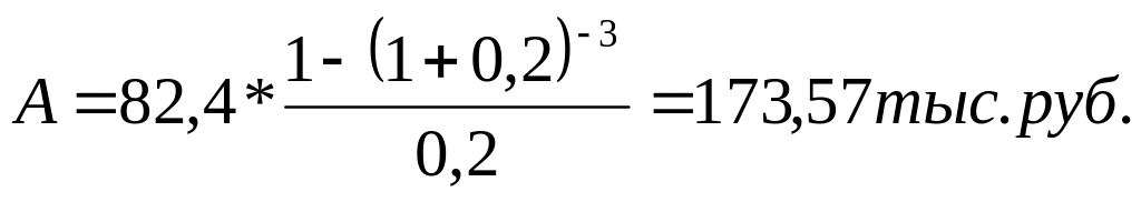 Пример 6. Предприятие планирует через 3 года проинвестировать проект, стоимостью 300 тыс. руб.; для этого оно создает соответствующий фонд (предприятие имеет возможность ассигновать на эти цели ежегодно 82.4 тыс. руб., помещая их в банк под 20% годовых). Какая сумма потребовалась бы предприятию для создания фонда в 300 тыс. руб., ели бы оно поместило ее в банк одномоментно на 3 года под 20% годовых.