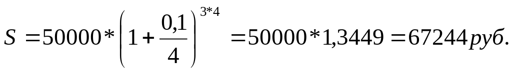 Пример 1. Средства в размере 50 000 руб. вложены на 3 года под 10% годовых; начисление процентов производится ежеквартально. Определить наращенную сумму денег.