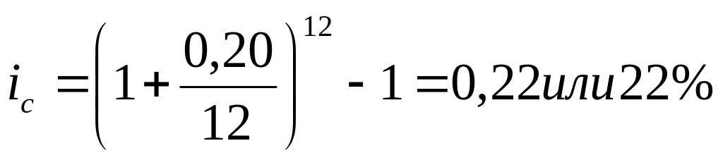 Пример 2. Определить эффективную ставку сложных процентов с тем, чтобы получить такую же наращенную сумму, как и при использовании номинальной ставки j=20 %, при ежемесячном начислении процентов (m=12):