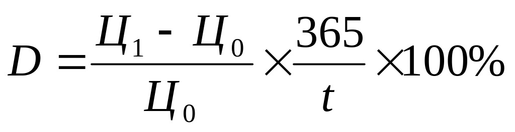 Если инвестор не получает текущих доходов в виде дивидендов (спекулятивные операции), то его доход составляет прирост курсовой стоимости. Доходность (в годовом исчислении) в этом случае рассчитывается по формуле: