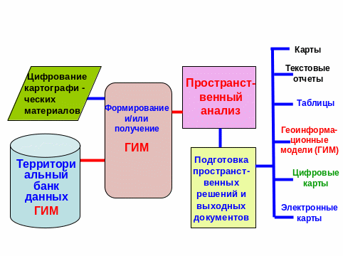 Технологический процесс геоинфомационной обработки данных на базе ГИС заключается в сборе исходных данных путем цифрования картографических материалов, формировании и/или получении из территориального банка данных геоинформационных моделей местности, пространственного анализа, подготовки пространственных решений и выходных документов в текстовом, табличном, графическом или картографическом виде, в том числе геоинформационных моделей, цифровых и электронных карт (рисунок 20).