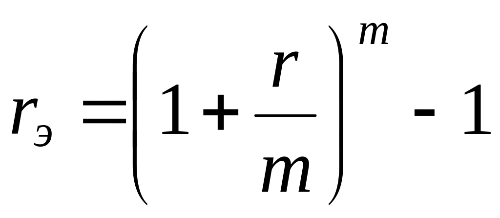 За визначенням ефективної процентної ставки маємо одну і ту ж величину майбутнього значення грошей, отриманих при нарахуванні відсотків m раз на рік при номінальній процентній ставці r, звідки легко слід: