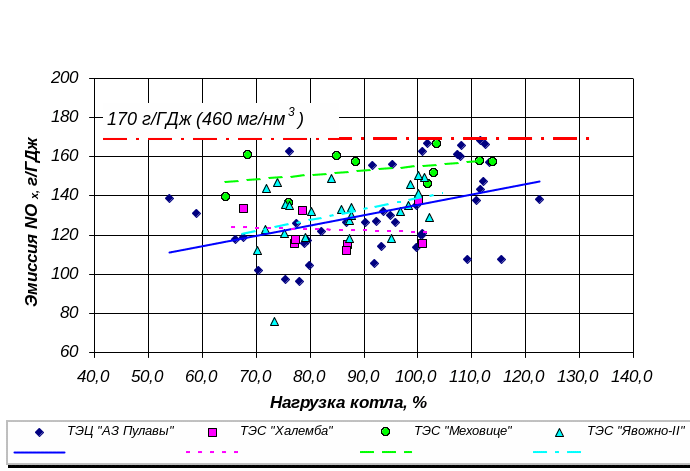Рис. 3.3. Зависимость эмиссии NOx в дымовых газах от нагрузки котлоагрегатов