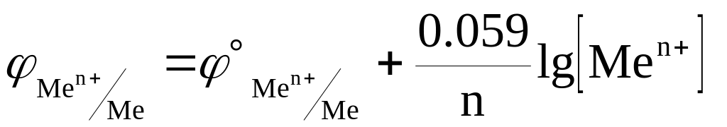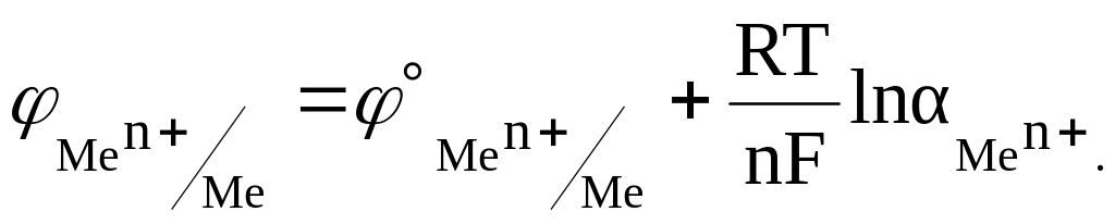 Потенціал металевого електрода, зануреного в розчин солі того ж самого металу з активністю а, обчислюють за рівнянням Нернста, яке в цьому разі має вигляд: