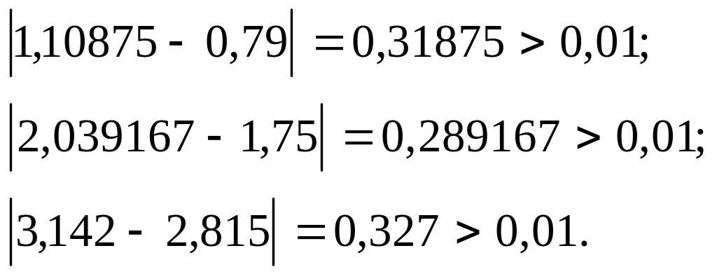 Требуемая точность вычислений еще не достигнута, т.е. необходимо продолжать вычислять следующие приближения.