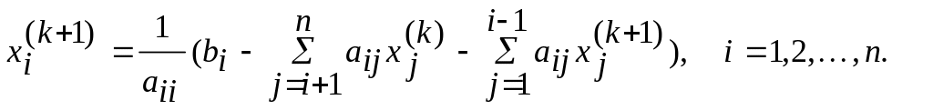 Постановка задачи и алгоритм решения систем линейных алгебраических уравнений аналогична методу простой итерации. Отличие заключается в том, что уточненные значения неизвестных используются сразу после их получения, а не после завершения расчетов всей итерации. В итоге изменяется расчетная формула метода, которая имеет вид: