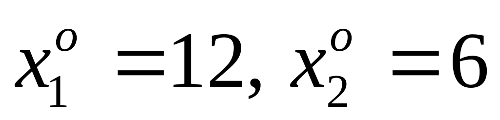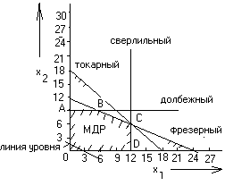При смещении линии уровня параллельно самой себе в направлении возрастания переменных и значение целевой функции растет и самое большое ее значение будет в точке С. В этой точке линия уровня еще касается многоугольника множества допустимых решений. Все точки на линии уровня определяют одну и ту же прибыль. На рис.1 точка С имеет координаты = 12 и = 6. Определим координаты точки С аналитически. В этой точке пересекаются две прямые линии, характеризующие существенные ограничения,