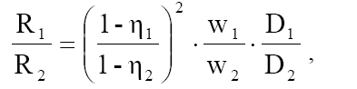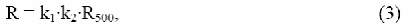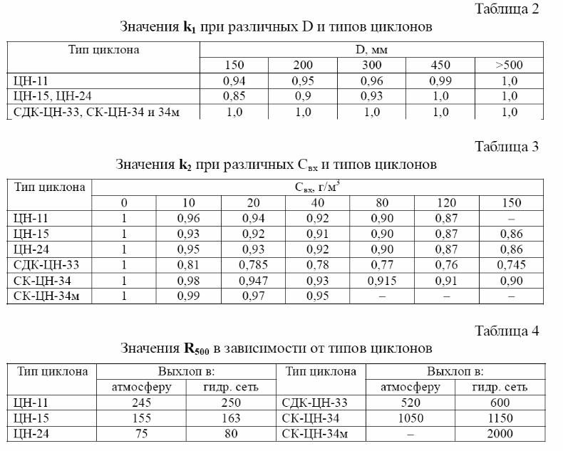 где k1 и k2 – поправочные коэффициенты, зависящие от D, Свх и типа циклона (табл. 2 и 3); R500 – коэффициент гидравлического сопротивления при D=500 мм (табл. 4).