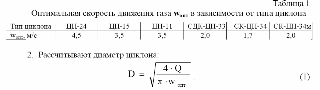 1. Определяют оптимальную скорость движения газа wопт в зависимости от типа циклона (табл. 1).
