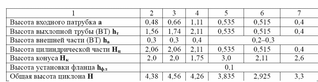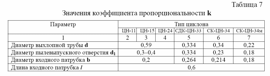 где х – параметр циклона (диаметр, ширина, высота); k – коэффициент пропорциональности (табл. 7).