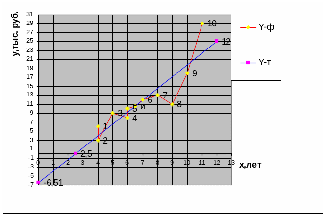 Примечание: xi-годы (лет); yi-тыс. руб. Принимаем: Σ (уiт-уiФ)2≈100.