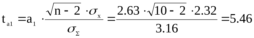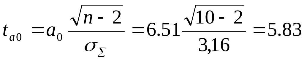 5) По tкр – критерию Стьюдента необходимо обосновать практическую значимость синтезированной по уравнению прямой (2) регрессионной модели (3) и ее параметров а0=-6,51 (без учета знака); а1=2,63 с учетом условия ta0 > tкр < ta (5). По вероятностной таблице для коэффициента значимости α =0,05 и количества степеней свободы ксв = n – 2 = 10 – 2 = 8 tкр=2,3 (с вероятностью Pt=0,95). Фактические значения t-критерия определить по формулам: