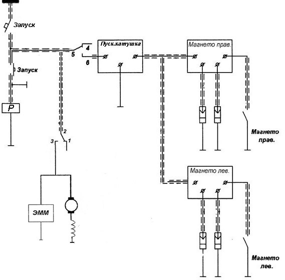 Запуск производится при включенных автомате защиты «ЗАПУСК» и выключателях магнето левом и правом (№1 и №2). При нажатии на кнопку запуска напряжение поступает на обмотку реле, которое срабатывает и контактами 2-3 подаёт напряжение на ЭПК, обеспечивая его открытие и подачу сжатого воздуха в цилиндры двигателя. Одновременно контакты 5-6 подают напряжение на пусковую катушку, которая преобразует напряжение 24÷27 В в напряжение 12÷18 кВ, которое через контакты в магнето подаётся на свечи, воспламеняя засасываемую в цилиндры двигателя топливо-воздушную смесь. Двигатель начинает работать.