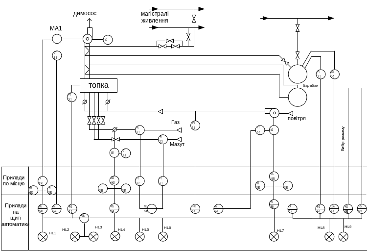 Сигналізація рівня води в барабані котла: LSA – сигналізатор рівня, HL8, HL9 – світлові індикатори нижнього і верхнього рівня.