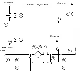 При аварії основної лінії, система автоматики перекриває її, і газ спрямовується через обвідну лінію (байпас). В обох випадках газ дроселюється до потрібного тиску регуляторами прямої дії.